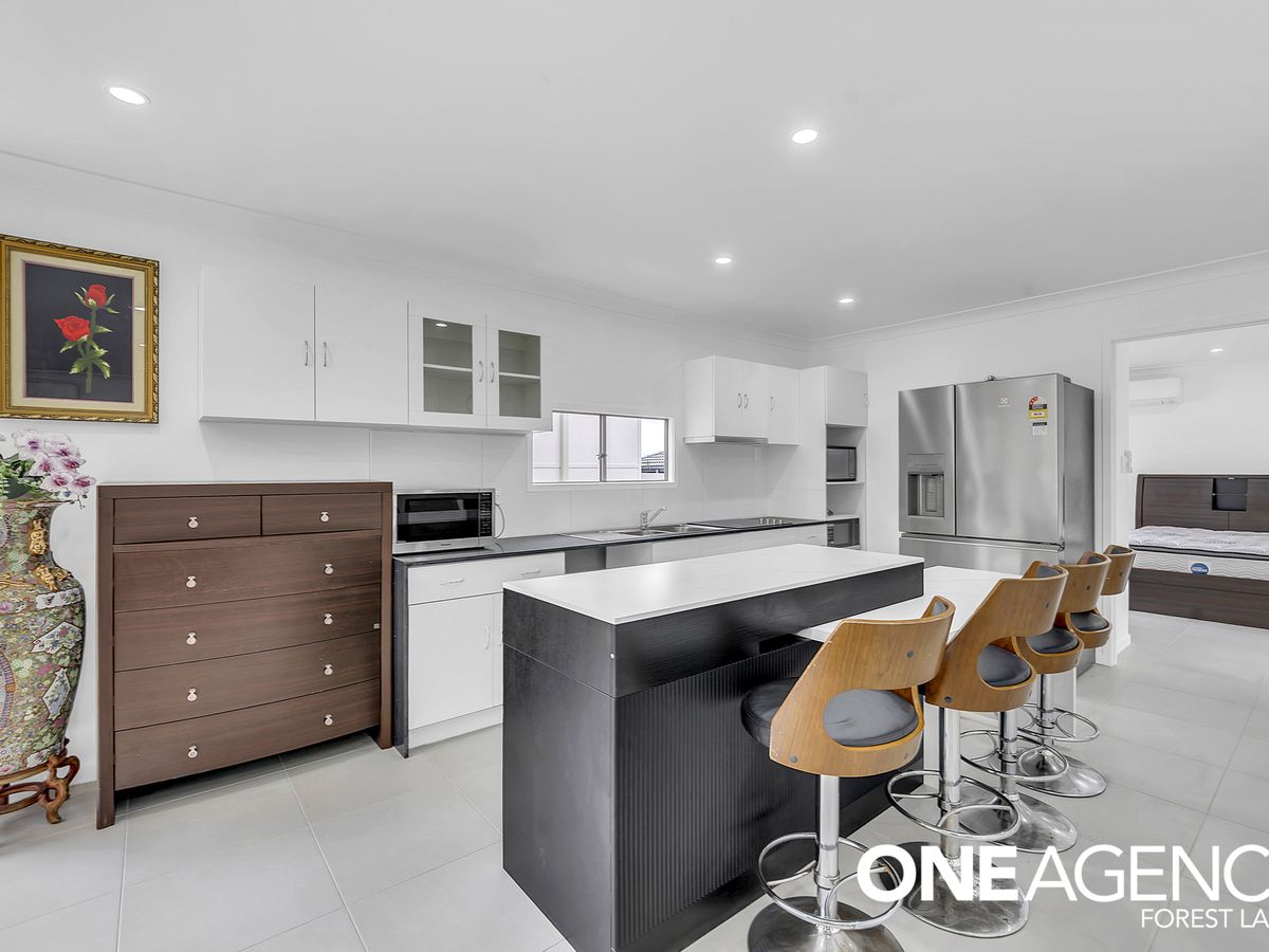 Sleek kitchen with stone benchtops, island bench, breakfast bar, electric cooktop, rangehood, double sink and ample storage